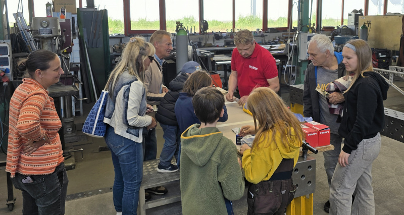 Besonders spannend war das Angebot für junge Menschen, die sich über die Berufe des Metallbauers und Technischen Systemplaners informieren wollten. An verschiedenen Werkstationen konnten sie selbst aktiv werden und erste Erfahrungen im Bereich Schweißen, Flexen und Bohren sammeln. Dabei konnten sie kleine Figuren, wie ein Flugzeug oder eine Schnecke aus Stahl, sowie auch einen Bilderrahmen aus Aluminium selbst herstellen.